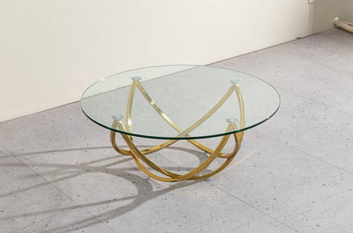 CLEGLAMOriginal price $599.99 - Original price $599.99Original price$599.99$599.99 - $599.99Current price $599.99| /In stockCircle glass top coffee table with decorative golden base! Dimensions: 40โ L x 40โ W x 16โ Hย